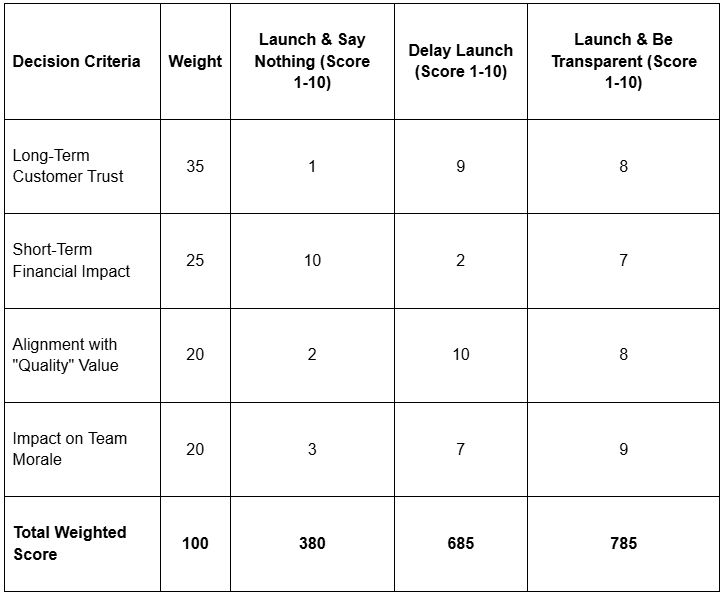They then score the three options against these criteria. The analysis, laid out in the matrix, made the trade-offs starkly clear: